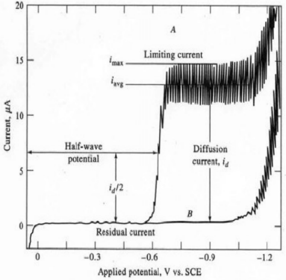 這種滴汞工作電極,因為面積很小,在電解時電流密度就會很大,電極附近的可還原物質(如金屬陽離子,Cd2+、Fe3+等)的濃度幾乎為零,于是因溶液中的濃度差而產生了濃差極化。此時,當我們控制恒定的電位進行電解時,所測得的極限擴散電流(Limiting Diffusion current)就與被測的可還原物質的濃度成正比關系,同時根據極限電流的躍升電位(半波電位,Half-wave potential),就可以對被測物質進行定性和定量了。