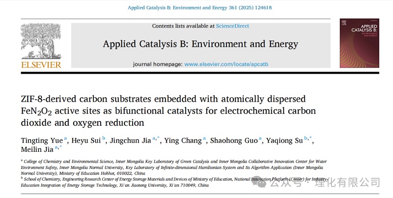 近日,內蒙古師范大學越婷婷團隊在國際期刊《Applied Catalysis B: Environment and Energy》(JCR一區)在線發表題為《ZIF-8-derived carbon substrates embedded with atomically dispersed FeN2O2 active sites as bifunctional catalysts for electrochemical carbon dioxide and oxygen reduction》論文,研究以硝酸鋅和2-甲基咪唑為原料,生長出具有菱形十二面體形態的ZIF-8。然后通過高溫煅燒釋放Zn,形成具有孔隙結構的含氮碳襯底。在700℃的煅燒過程中,Fe原子被物理吸附在含氮碳基體上,并與N/O結合形成FeN2O2反應位點。對于CO2RR, FeN2O2/NC表現出優異的催化性能,在?0.7?V下實現了95.5?%的法拉第效率。在堿性條件下,其ORR性能(E1/2 = 0.83?V)與Pt/C (E1/2 = 0.82?V)相當。該研究不僅提出了一種高效節能的CO2RR方法,而且為ORR的高活性催化劑提供了新的思路。